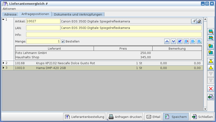 Haben Sie alle Daten zum Lieferantenvergleich eingegeben oder verändert und sollen diese im System gespeichert werden, dann klicken Sie die Schaltfläche [Speichern] mit der linken Maustaste an oder betätigen die Tastenkombination Strg-E. Damit werden alle Daten wie angezeigt zu der Lieferantenanfrage gespeichert.