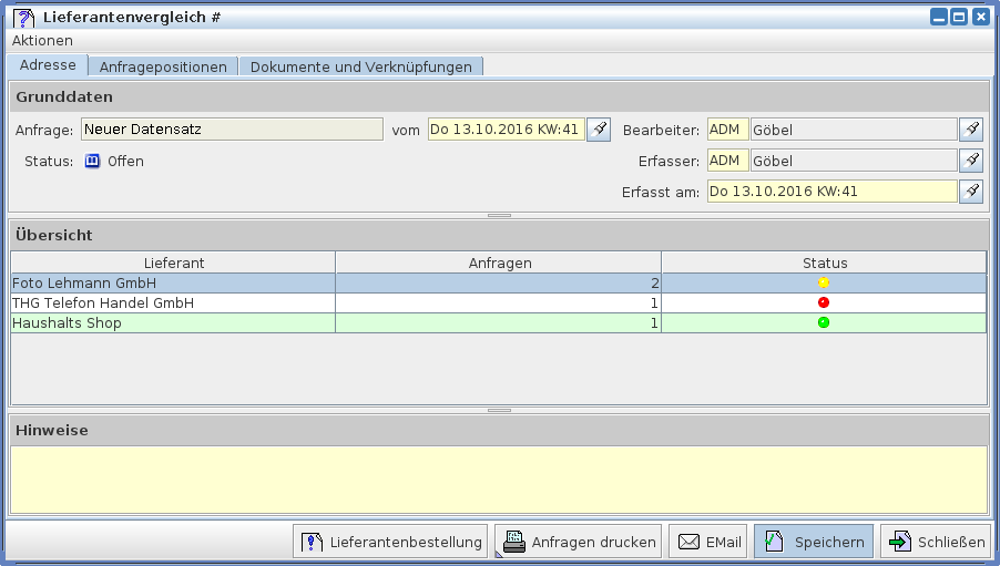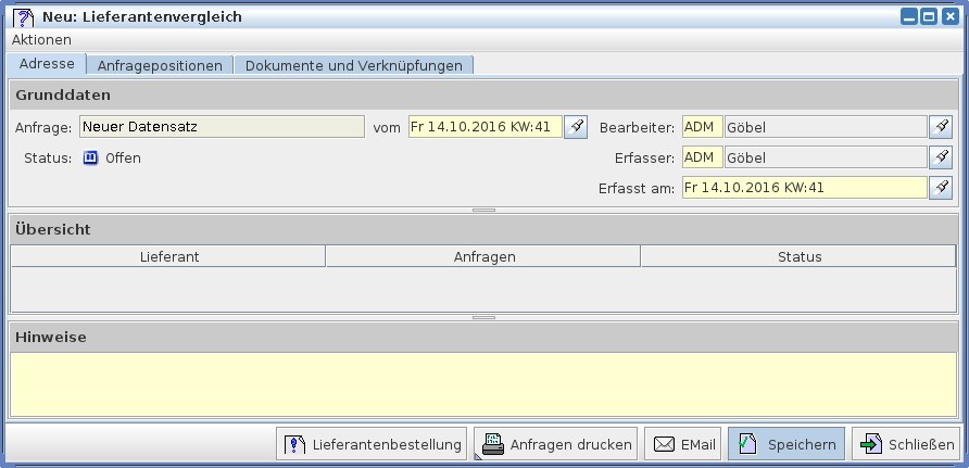 Man sieht hier schon, dass beim Erstellen eines neuen Lieferantenvergleichs zunächst ein recht leerer Dialog erscheint. Bis auf Angabe des Status, Datums und Bearbeiters gibt es hier noch nicht allzu viel zu sehen. Denn hier findet die Eingabe der notwendigen Daten nicht über den Reiter "Adresse", wie üblich statt, sondern in erster Linie über den nachfolgenden Reiter "Anfragepositionen".