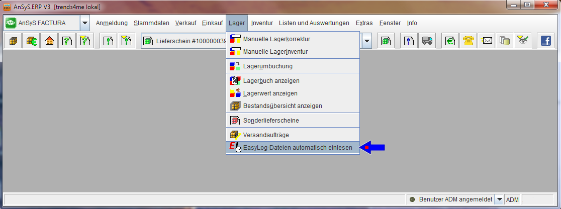 Folgend zeigen wir Ihnen noch, in welchem Menü Sie diesen Vorgang anstoßen, damit die Trackingnummern den Lieferscheinen zugeordnet werden. Dazu wechseln Sie jetzt in das Modul 'AnSyS FACTURA' und wählen im Menü das 'Lager' aus. In der Ihnen dargebotenen Auswahlliste, finden Sie die Option 'EasyLog-Dateien automatisch einlesen'. Diesen Eintrag bestätigen Sie.