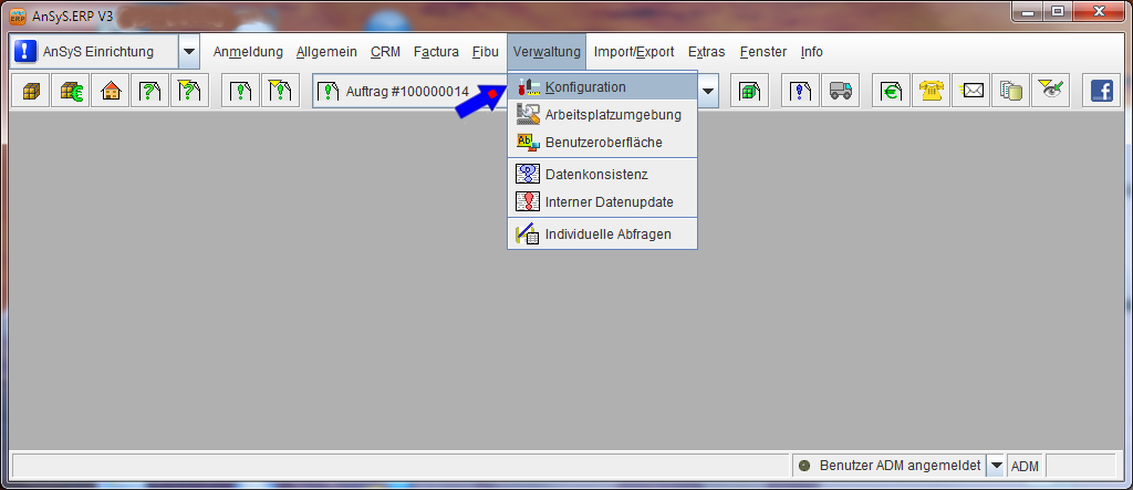 Dazu wählen Sie zuerst das Modul 'AnSyS Einrichtung' aus. Anschließend navigieren Sie im Menü auf 'Verwaltung'. In der Ihnen angebotenen Auswahlliste, wählen Sie 'Konfiguration' aus.