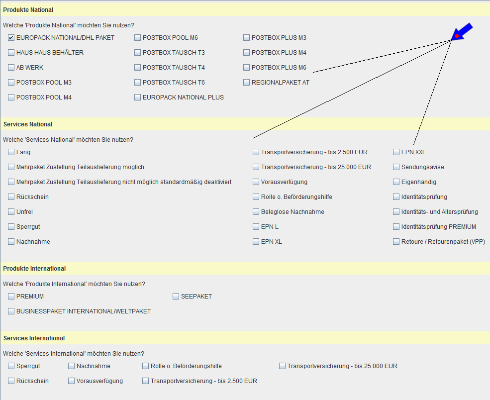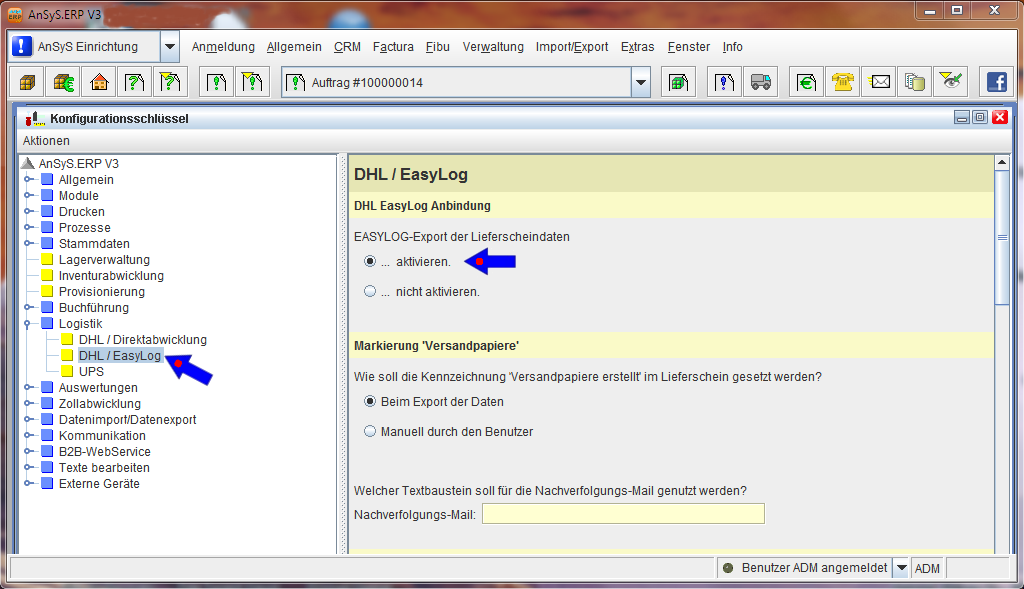 Zu aller erst muss dass 'DHL/Easy-Log' im Programm aktiviert werden. Markieren Sie einfach die entsprechende Position, wie es in der unteren Abbildung gezeigt wird.