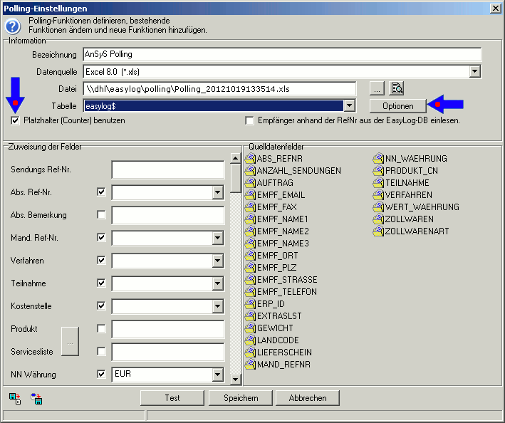 Als nächstes müssen Sie jetzt die EasyLog-Pollingeinstellungen vornehmen. Dazu gibt es ein Handbuch von DHL, indem dies detailliert beschrieben wird. Auf einige Dinge möchten wir da besonders hinweisen, da es sonst zu Fehlermeldungen später kommt. Wo Sie die Pollingeinstellungen vornehmen, sehen Sie in dem unten abgebildeten Dialog (Abbildung 7). Zuerst tragen Sie eine Bezeichnung ein. Dann wählen Sie die Datenquelle aus, wie in der Abbildung 7 zu sehen ist. Nun hinterlegen Sie den Pfad, wo die Pollingdatei abgelegt wird, vergessen Sie dabei auch nicht das Tabellenblatt auszuwählen. Jetzt dürfen Sie nicht das Häkchen vergessen bei 'Platzhalter (Counter) benutzen'. Somit können Sie die Einstellungen wieder bearbeiten, falls was nachgebessert werden muss. Zudem ist notwendig, das Sie auch über die Schaltfläche 'Optionen' wichtige Einstellungen durchführen. Diese sehen Sie in der Abbildung 8. Im Anschluss diese Eintragungen speichern. Der Dialog schließt sich nun wieder.