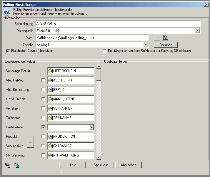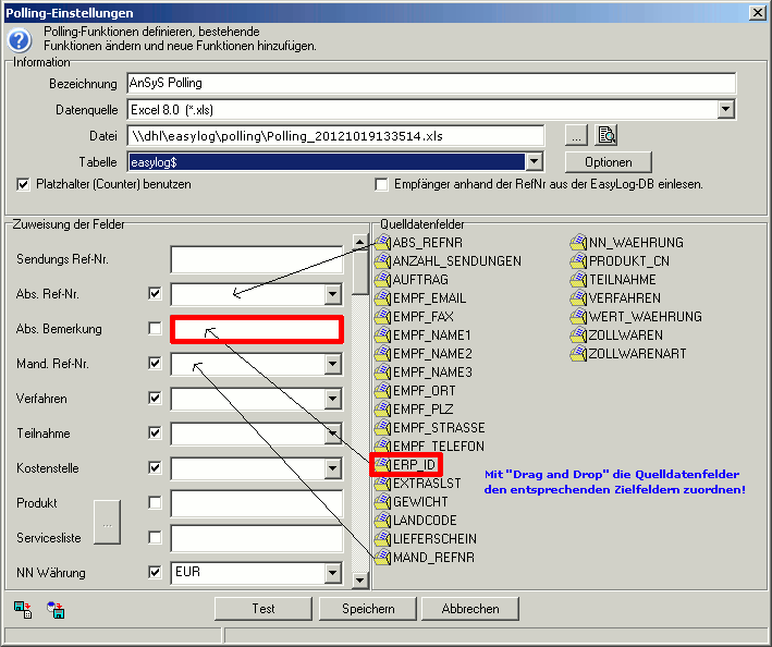 Hinweis: Was hier sehr wichtig ist, ist die Zuordnung des Quelldatenfeldes 'ERP_ID' in das Feld 'Abs. Bemerkung'. Die 'ERP_ID' muss genau in diesem Feld abgelegt werden. Werden nämlich die Versandaufträge an DHL übermittelt, bekommt jeder Versandauftrag eine Trackingnummer. Diese 'ERP_ID' sorgt dafür später, das die erhaltene Trackingnummer dem Lieferschein wieder zugeordnet und somit in den Lieferschein eingelesen werden kann.
