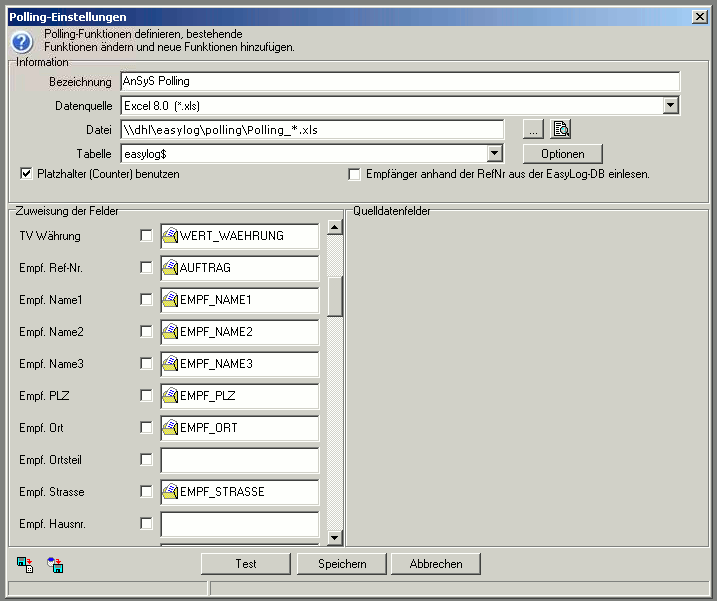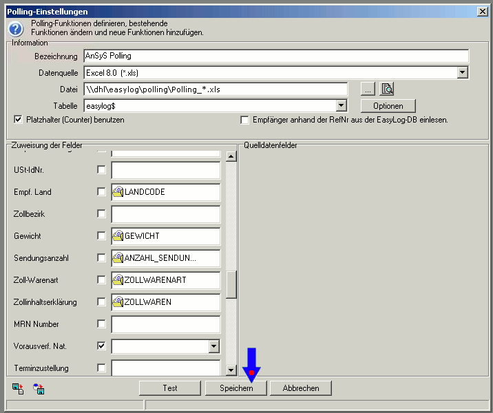 Nachdem alle Quelldatenfelder zugewiesen sind, ist das ganze noch zu speichern mit dem 'Speicher'-Button. Im Prinzip sind das die Einstellungen, die vorgenommen werden müssen, damit die Daten korrekt verarbeitet werden.
