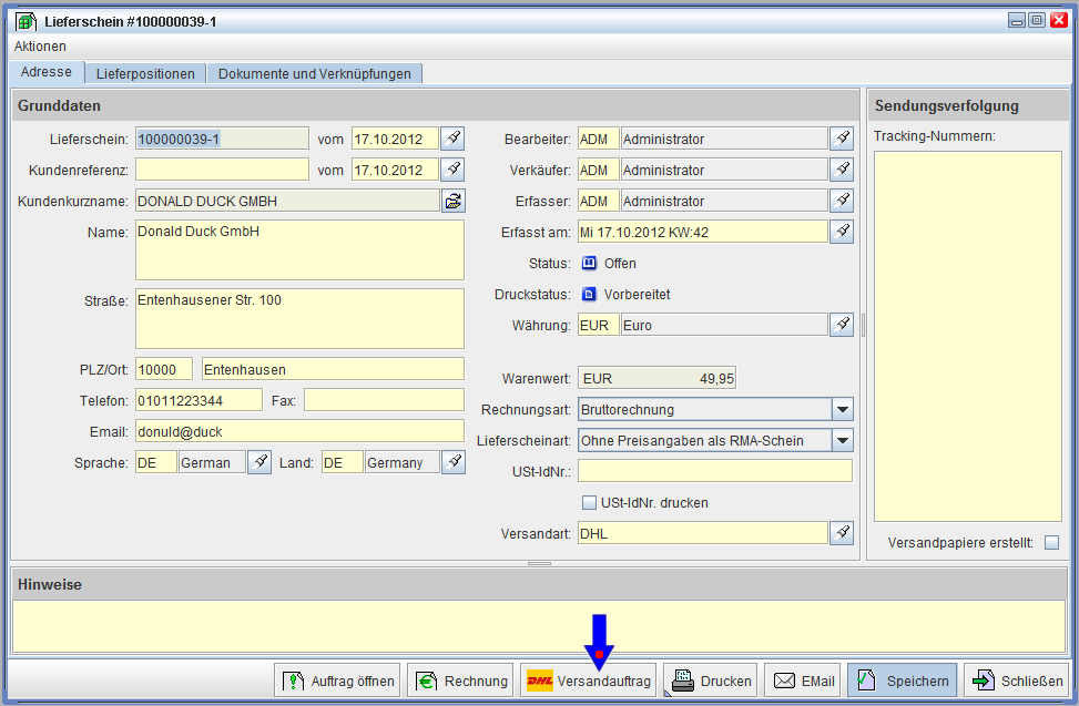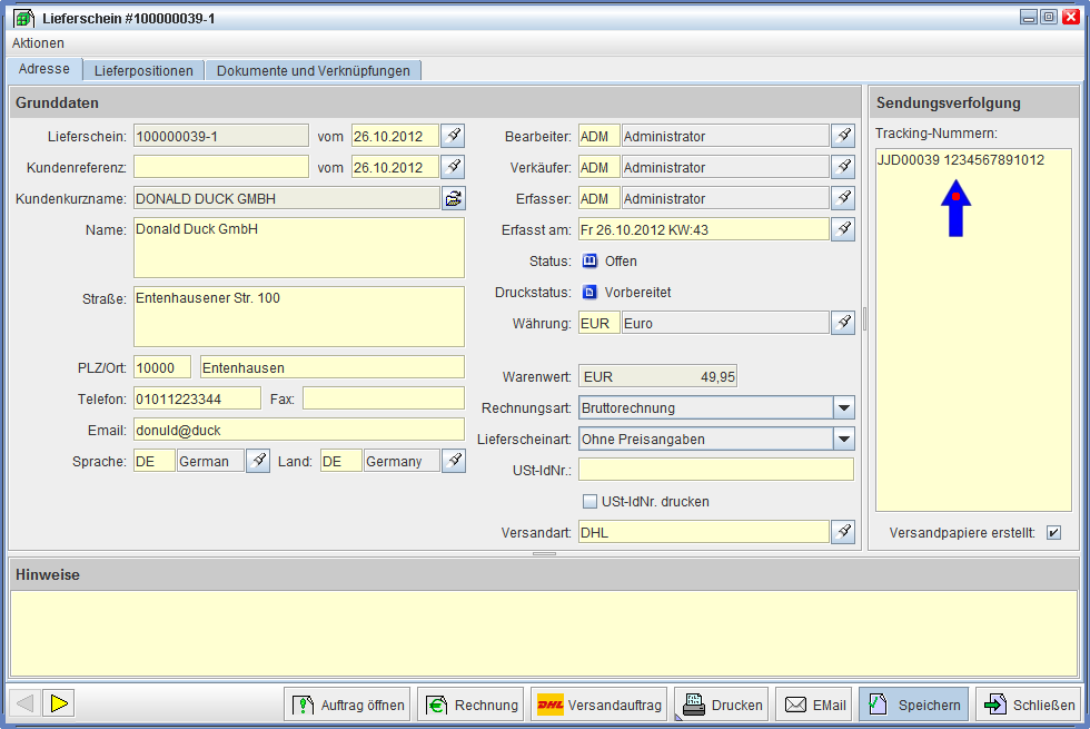 Sie öffnen nunmehr einen Lieferschein, wo Sie Wissen, das auch ein Versandauftrag erstellt wurde. Hier sollten Sie nun die eingetragene Trackingnummer vorfinden.