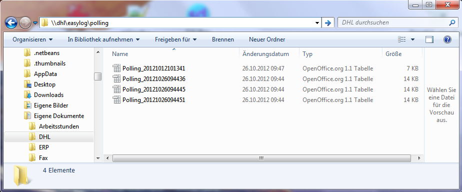 Hier sehen Sie nun die Teilnahme, Verfahren und das Produkt von DHL. Zudem sind hier die Angaben vom Sendungsempfänger, Warenwert, Gewicht und Kommunikationsdaten eingetragen. Sie können die Daten nun überprüfen und wenn notwendig auch abändern bzw. ergänzende Eintragungen vornehmen. Wenn Sie jetzt mit dem 'OK' – Button die Eintragungen speichern, wird eine Polling-Datei erstellt und in dem Verzeichnis abgelegt, das in der Konfiguration angegeben ist (Abbildung 5). In diesem Verzeichnis finden Sie alle Pollingdateien, die entstehen, wenn Sie einen Versandauftrag erstellen und diesen bestätigen. Für jeden Versandauftrag entsteht eine eigene Pollingdatei.