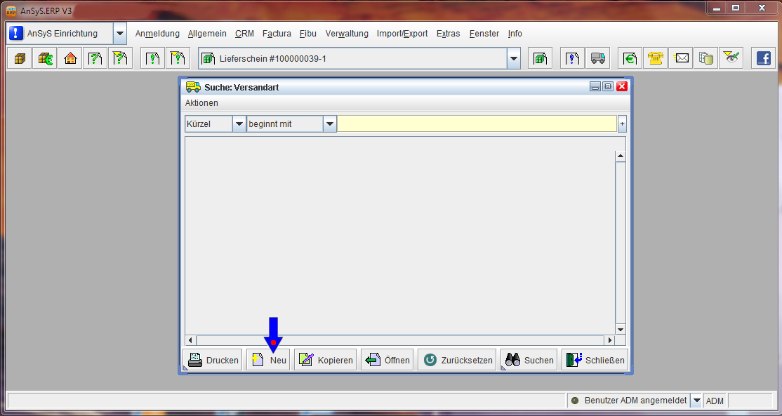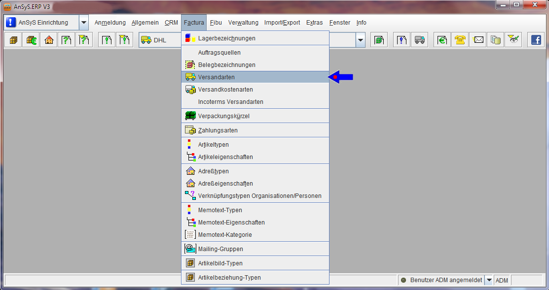 Jetzt legen Sie die Versandarten an. Sie bleiben im gleichen Modul, wählen im Menü wieder 'Factura' und in der Auswahlliste diesmal 'Versandarten'.