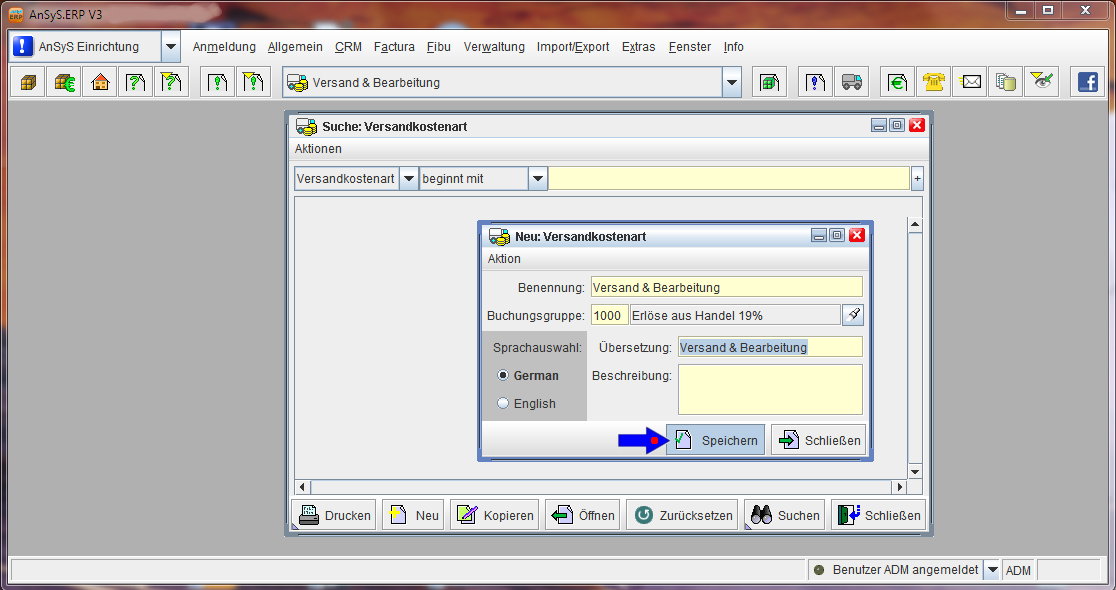 Über den Button 'Neu' legen Sie nun eine neue Versandkostenart an. In dem erscheinenden Dialog, geben Sie der Versandkostenart eine Benennung. Sie wählen noch die richtige Buchungsgruppe (wichtig für die FiBu) und speichern die neu angelegte Versandkostenart mit der 'Speichern' - Schaltfläche ab.