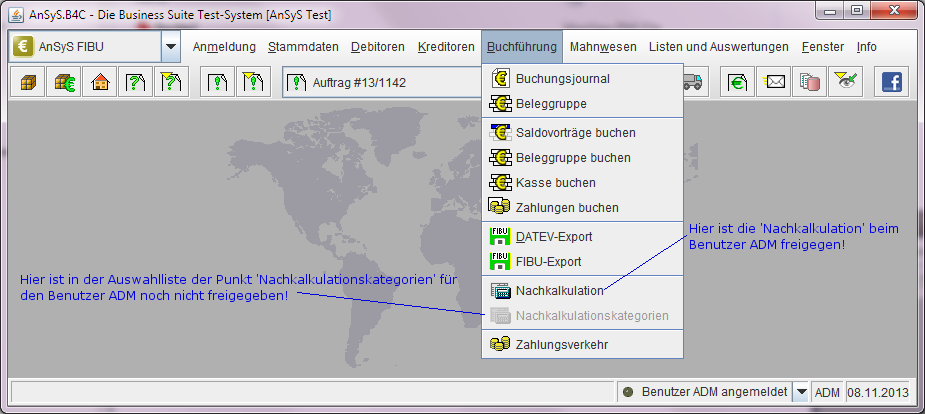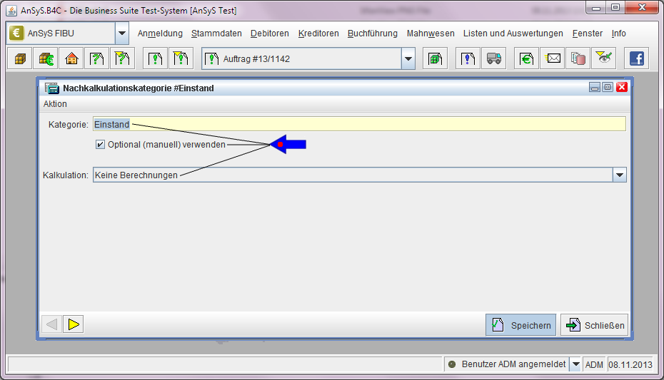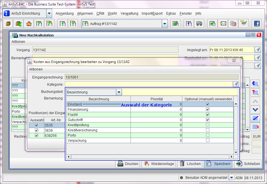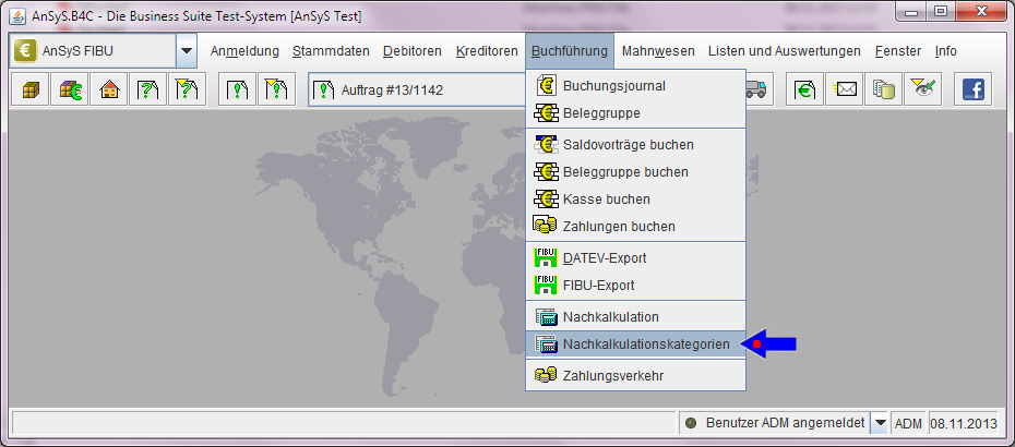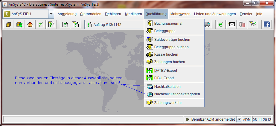 Wenn unser AnSyS.B4C wieder gestartet ist, sollten Sie in jedem Falle zuerst prüfen, ob nun die zwei neuen Auswahlbezeichnungen 'Nachkalkulation' und 'Nachkalkulationskategorien' vorhanden und diese auch aktiv sind.