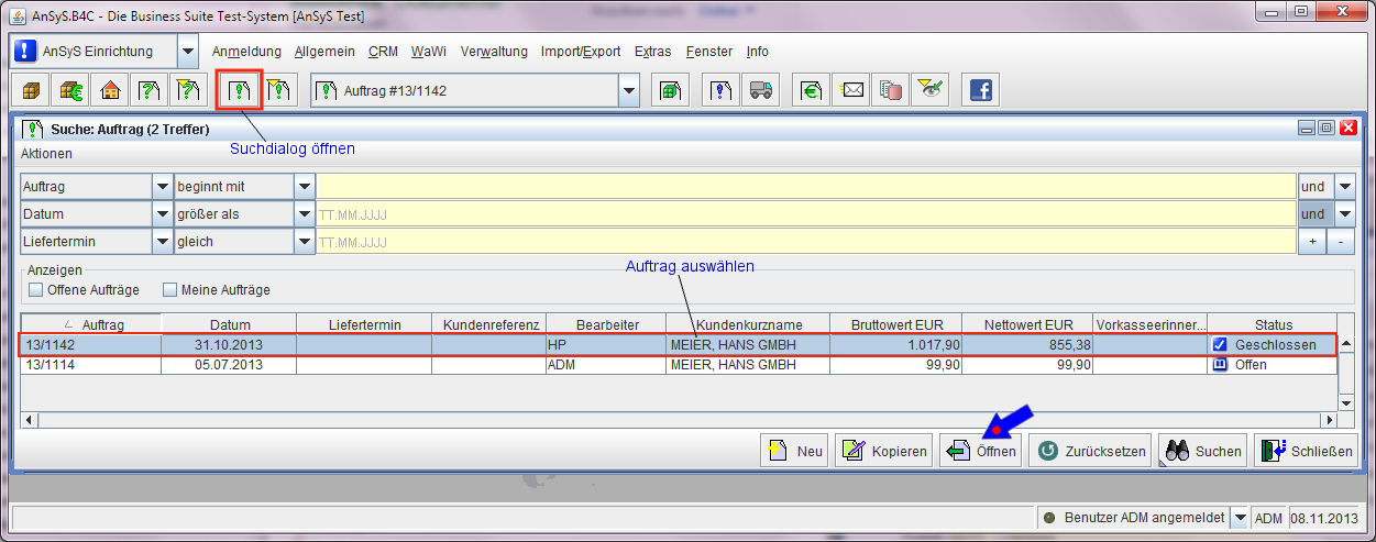 In unserem Beispiel sehen Sie nun zwei Aufträge, wobei wir den Auftrag auswählen der bereits geschlossen ist. Ein Auftrag der noch 'Offen', sollte man nicht auswählen, da sich ja noch was ändern könnte.