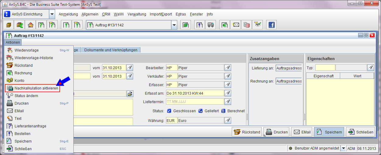 Über die Schaltfläche 'Öffnen' oder mit einem Doppelklick, läßt sich nun der selektierte Auftrag öffnen. Ist der Auftrag geöffnet, wählen Sie über 'Aktionen' in der Auswahlliste 'Nachkalkulation aktivieren' aus.
