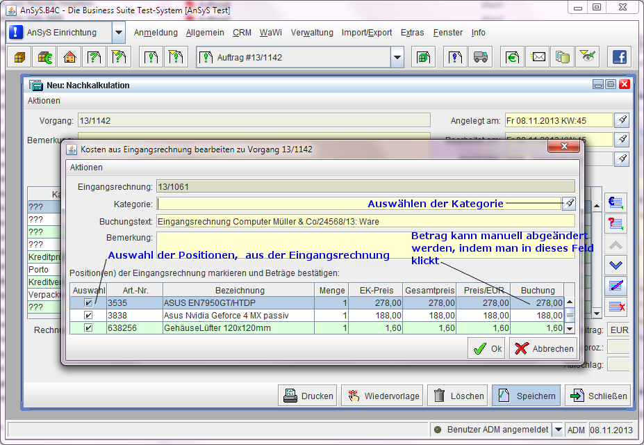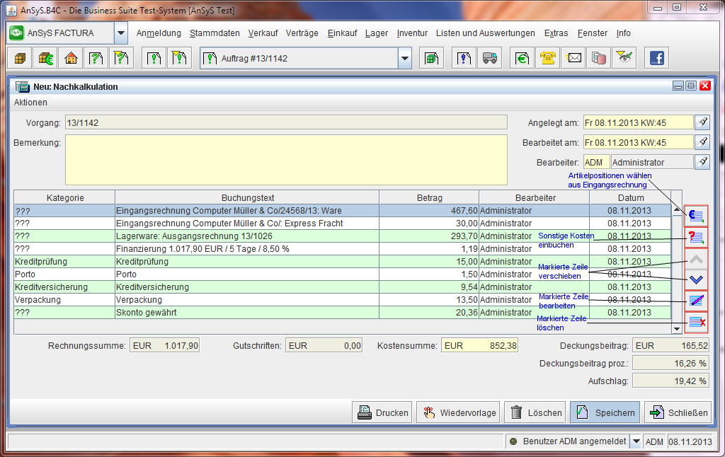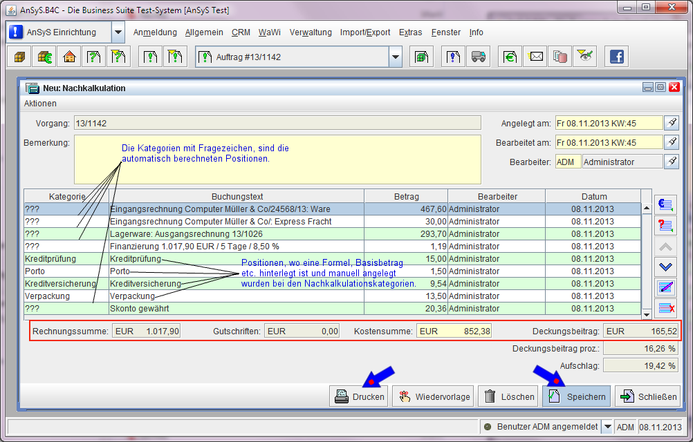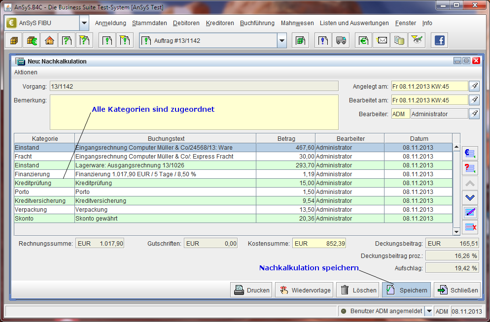 anhand von hinterlegten Formeln und Funktionen. Diese Nachkalkulationskategorien wurden dafür extra in unserm Beispiel dazu angelegt, um Ihnen dies zu demonstrieren.