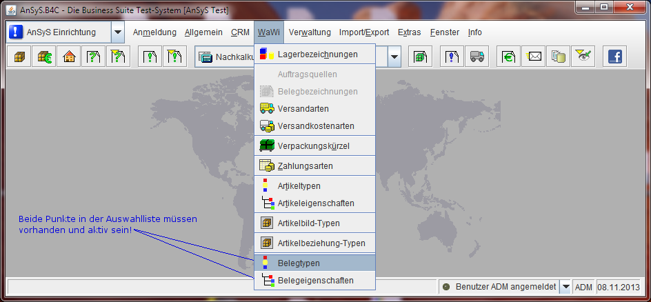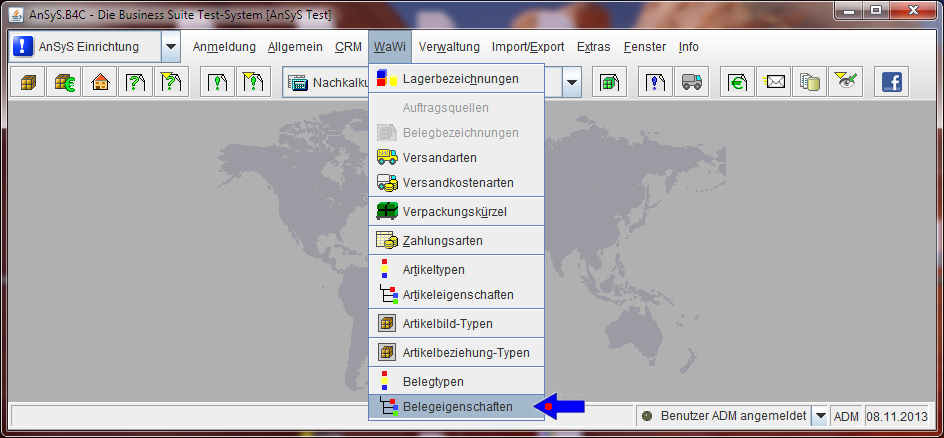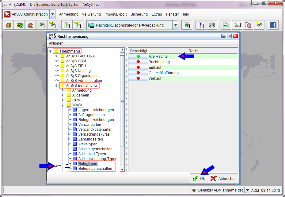Nach dem Neustart sollten Sie die zwei Einträge in der Auswahlliste unter 'AnSyS Einrichtung' > 'WaWi' > 'Belegtypen' und 'Belegeigenschaften' sehen können. Es kann nun notwendig sein, das Sie die zwei Punkte in der Rechtezuweisung noch frei geben müssen (falls noch nicht geschehen). Wie man die Rechtezuweisung aufruft, habe wir Ihnen bereits unter 'Rechtezuweisung für die Nachkalkulation' gezeigt.