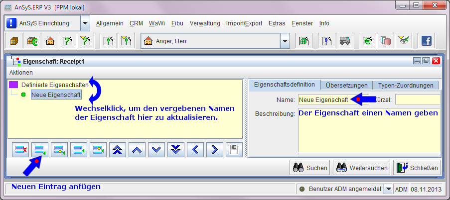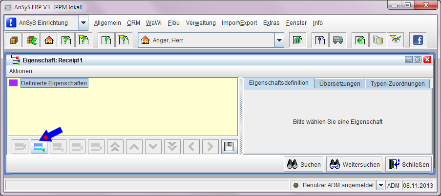 Wenn Sie auf die Schaltfläche (wie im Bild sichtbar) klicken, wird eine neue Belegeigenschaft erstellt mit dem Namen 'Neue Eigenschaft'. Mit den anderen Schaltflächen, können Sie die Eigenschaften entsprechend verschieben und positionieren oder auch wieder löschen.