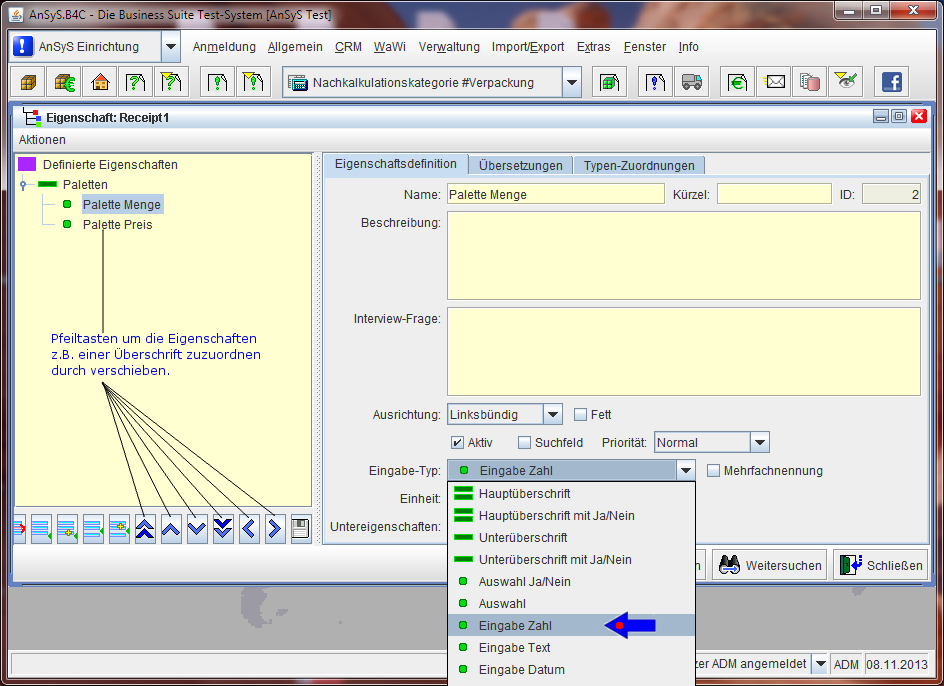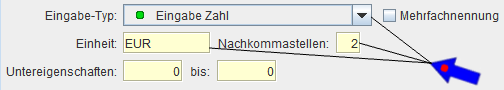 Zusätzlich kann man jetzt noch auswählen, um welchen Eingabe-Typ es sich handelt. Dies legen Sie entsprechend der Ihnen dargebotenen Auswahlliste fest. In unserem Beispiel verwenden wir den Eingabe-Typ 'Eingabe Zahl'. Bei 'Einheit' tragen wir einmal 'Stk.' ein für die 'Palette Menge' und 'EUR' für die Eigenschaft 'Palette Preis'. Bei 'Palette Preis' tragen wir noch zusätzlich bei 'Nachkommastellen' die '2' ein, da dies bei Preisen ja durchaus vorkommen kann, um später einen genauen Wert eintragen zu können.