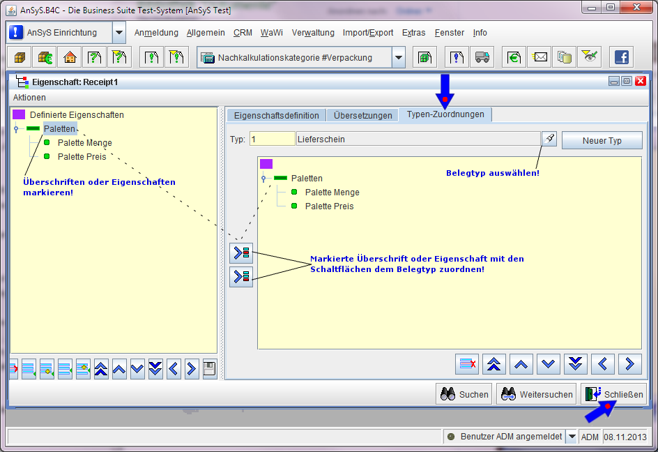Nun müssen die Eigenschaften noch dem Belegtyp 'Lieferschein' zugeordnet werden. Dazu wechseln Sie jetzt auf den Reiter 'Typen-Zuordnung' und wählen nun den zuvor angelegten Belegtyp 'Lieferschein' aus. Jetzt markieren Sie die Unterüberschrift 'Paletten' mit den Eigenschaften 'Palette Menge' und 'Palette Preis' und „schieben“ dies mit einem Klick als ganzes hinüber zu dem Belegtyp 'Lieferschein', mit einer der Schaltflächen die Sie zwischen den beiden Bereichen sehen. Und schon sind die Eigenschaften dem Belegtyp zugeordnet. Mit einzelnen Eigenschaften verfährt man genauso. Am Ende sieht das so aus, wie in unserem Beispiel.