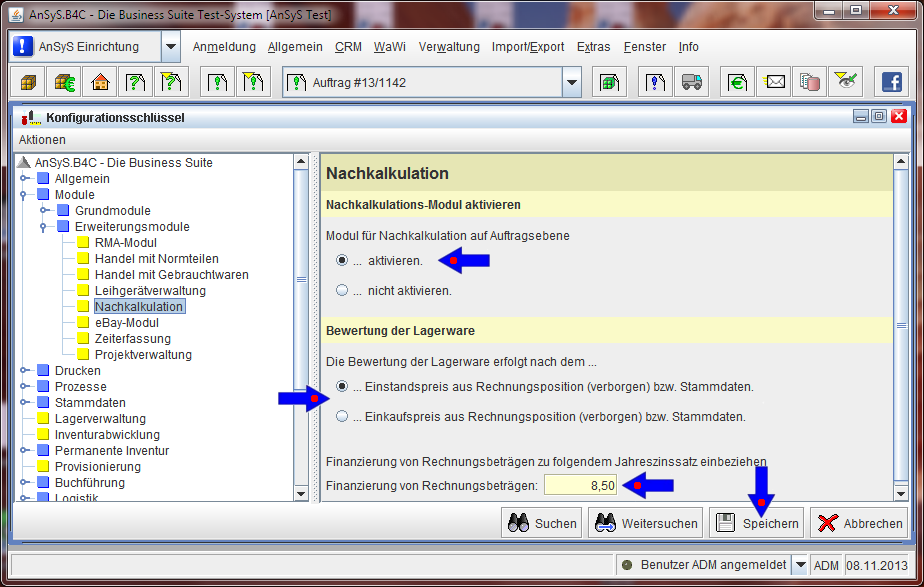 Aktivieren der 'Nachkalkulation' in der Konfiguration