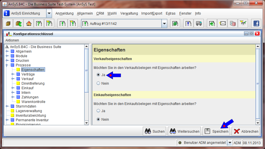 Zuerst muss in der Konfiguration unseres AnSyS.B4C eingestellt werden, das Sie mit Belegeigenschaften arbeiten. Wie Sie in die Konfiguration gelangen, haben wir bereits beschrieben unter 'Aktivieren der 'Nachkalkulation' in der Konfiguration'.