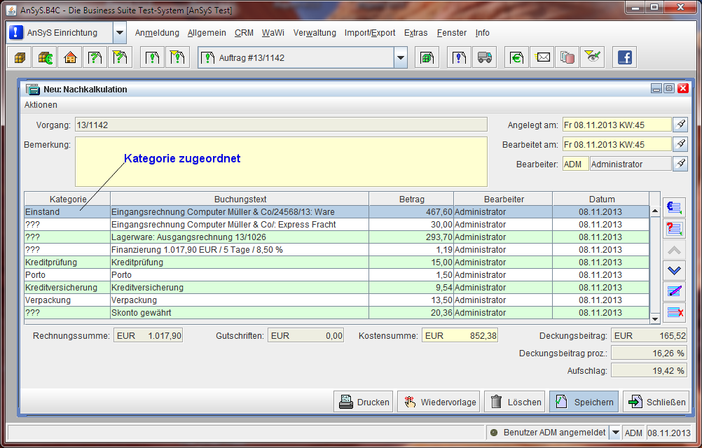 Alle Positionen mit Fragezeichen die Sie in der Spalte 'Kategorie' sehen, sind Belege, die mit dem Auftrag verknüpft sind und von der Nachkalkulation automatisch erfasst wurden. Alle anderen Positionen sind Positionen, wo was berechnet werden soll in der Nachkalkulation,