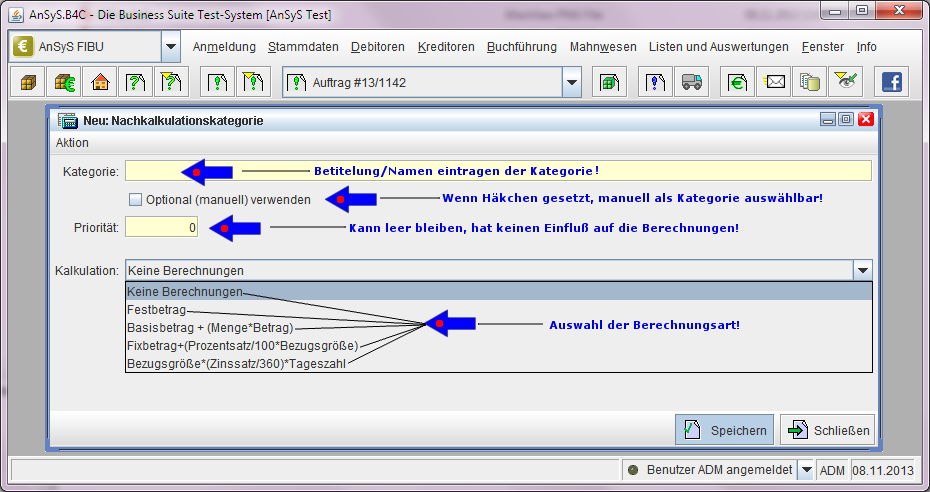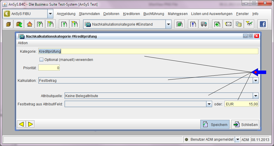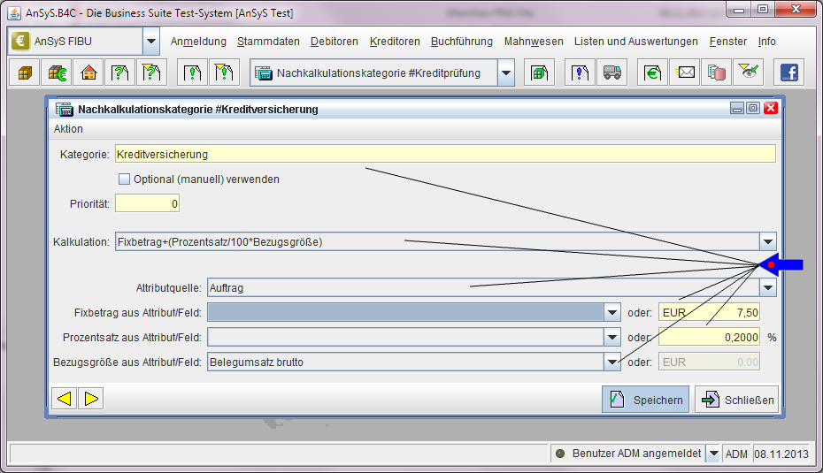 Desweiteren legen wir eine Nachkalkulationskategorie für eine Kreditversicherung an, um sich vor Zahlungsausfällen zu schützen. Hier wird eine Formel für die Kalkulation, ein Prozentsatz und ein Fixbetrag hinterlegt, der den Betrag errechnet für die die Versicherungsprämie zu zahlen ist.