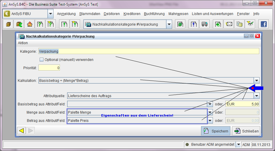 In unserem Beispiel haben wir in der Kalkulation einen Basisbetrag und multiplizieren die 'Menge*Preis' aus den Belegeigenschaften des Lieferscheins=Attributquelle.
