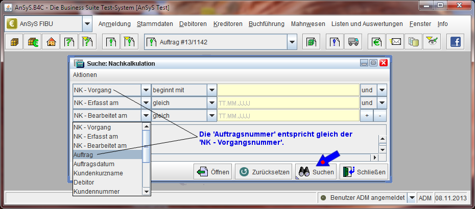 Suchdialog Nachkalkulation und Bearbeitung