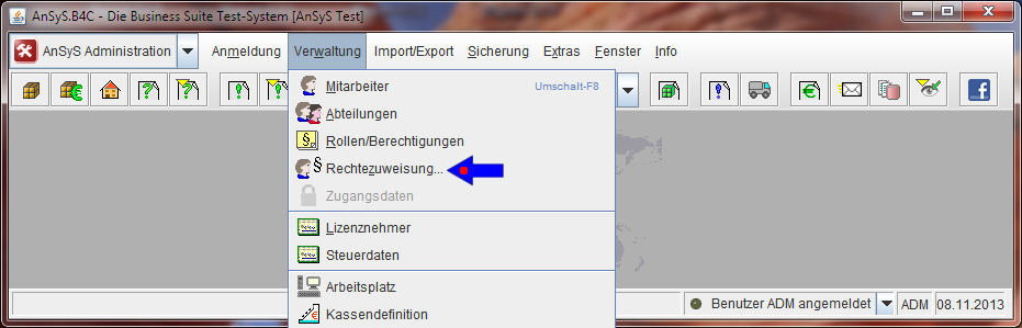 Dazu wechseln Sie in das Modul 'AnSyS Administration'. Im Menü wählen Sie 'Verwaltung' > '§ Rechtezuweisung...' und öffnen diese mit einem Klick. Die folgende Abbildung zeigt Ihnen dies.