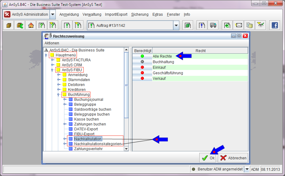 In dem sich nun öffnenden Dialog der Rechtezuweisung, navigieren Sie auf der sich linken Seite befindlichen Baumstruktur bis zur Nachkalkulation, indem Sie die Ordner einfach nach unten aufklappen und sich bis dorthin hindurch klicken. Diese Stellen haben wir in unserer nächsten Abbildung rot umrandet.