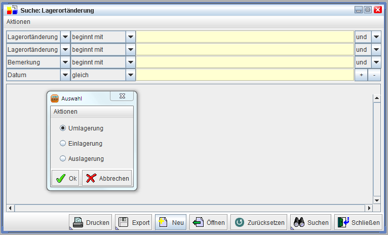 Nach dieser Auswahl stehen Sie dann im Suchdialog für 'Lagerortänderung'. Wenn Sie nun auf 'Neu' klicken, werden Sie gefragt, was Sie denn genau tun möchten. Eine 'Umlagerung', 'Einlagerung' oder 'Auslagerung'. Sie bestätigen Ihre Auswahl entsprechend mit 'Ok'.