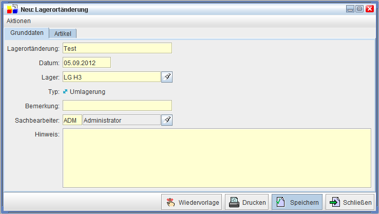 Nachdem der Reiter 'Grunddaten' ausgefüllt und bearbeitet ist, wechseln Sie auf den Reiter 'Artikel'. Denn nun müssen Sie nur noch dem System mitteilen, welcher Artikel umgelagert werden soll.