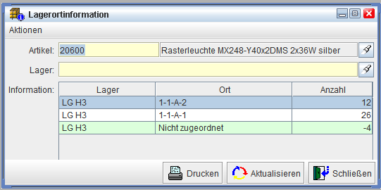Liegt Ihnen die Artikelnummer bereits vor, geben Sie diese direkt ein, ansonsten suchen Sie sich Ihren Artikel über den Ihnen bereits bekannten Suchdialog (Symbol Taschenlampe). Nun noch auf den Button 'Aktualisieren' drücken und schon werden Ihnen die Lagerorte und die Anzahl der Artikel angezeigt.