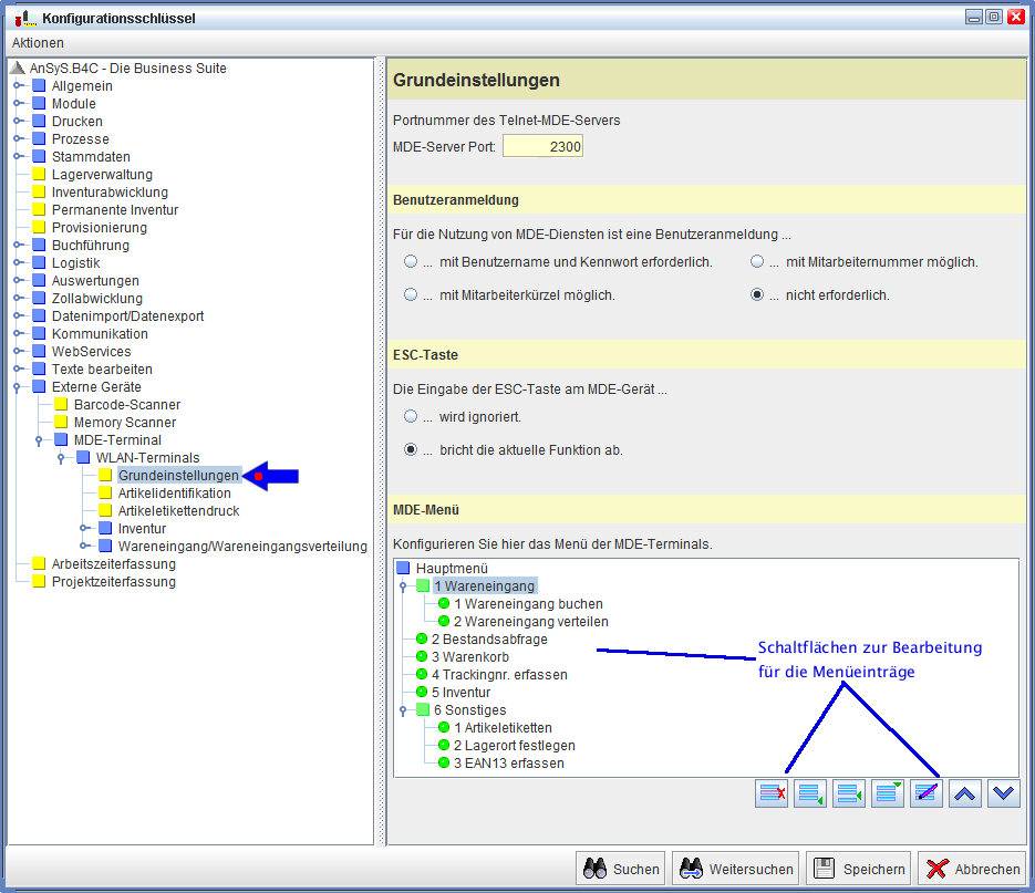Die Nachfolgende Abbildung zeigt Ihnen, wo Sie die Einstellungen für die Menüeinträge Ihres MDE-Gerätes vornehmen können.