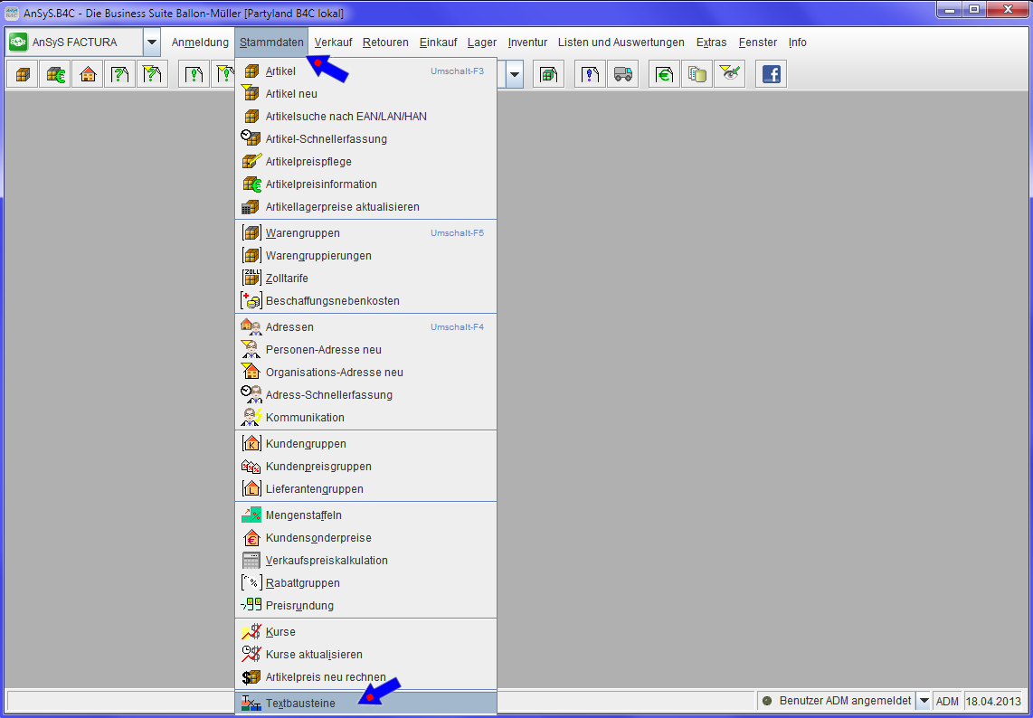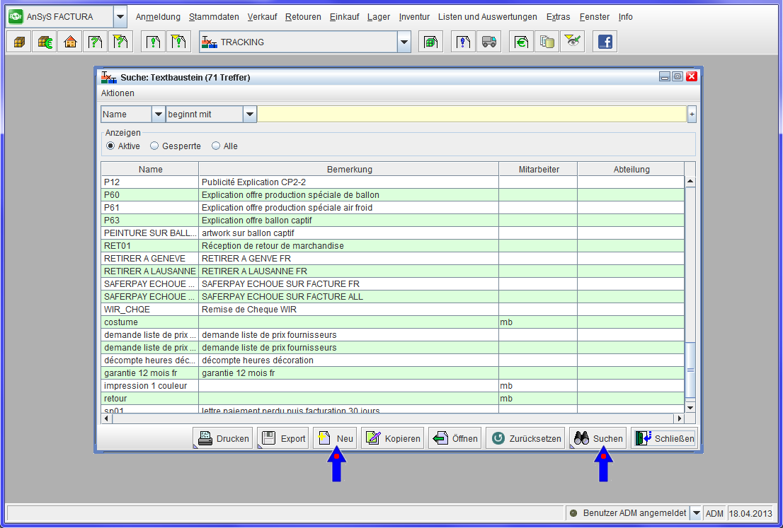 Man begibt sich ins Modul 'AnSyS FACTURA' → 'Stammdaten' → 'Textbausteine'