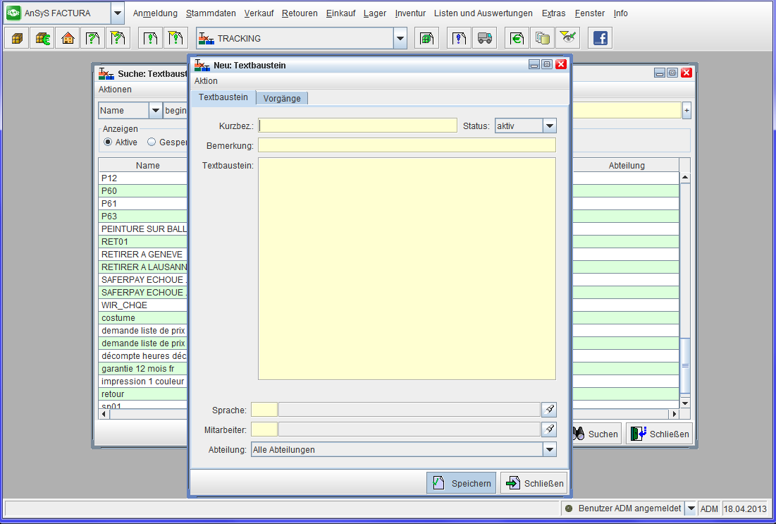Wird die Schaltfläche 'Suchen' betätigt, erscheinen bereits angelegte Textbausteine. Benötigt man einen neuen Textbaustein, kann man diesen über die Schaltfläche 'Neu' anlegen.