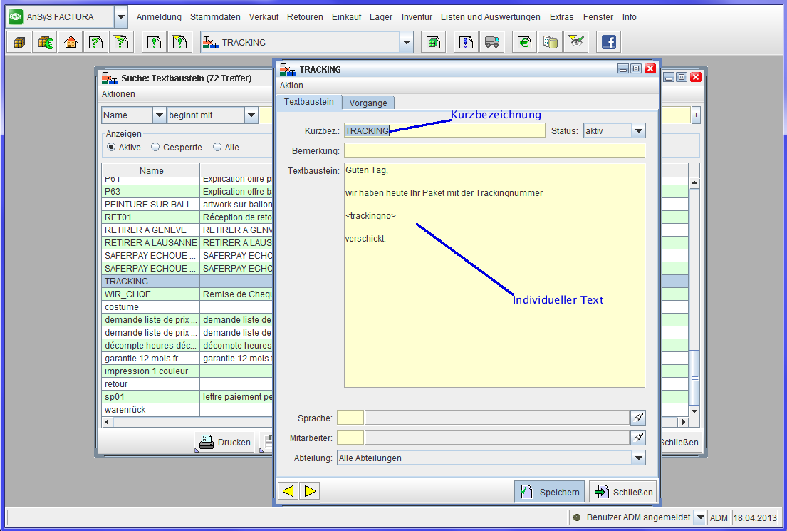 Jeder Textbaustein erhält eine Kurzbezeichnung. Da es sich hier um den Textbaustein handelt, der mit der Trackinginformation an den Kunden gesendet werden soll, benennen wir diesen kurzerhand 'TRACKING'. Dazu schreiben Sie in das Feld 'Kurzbez.:' =Kurzbezeichnung dieses Wort. Sie dürfen natürlich gerne die Groß- Kleinschreibung benutzen und auch einen anderen Namen verwenden. In unserem Beispiel haben wir die Kurzbezeichnung in Großbuchstaben geschrieben. Anschließend geben Sie noch Ihren individuellen Text ein, den der Kunde erhalten soll. Es gibt Variablen, die automatisch Informationen wiedergeben, wenn diese benutzt werden. Wie z.B. in unserem Textbaustein 'TRACKER' die Trackingnummer → <trackingno>. Die Variablen müssen in spitzen Klammern geschrieben sein, damit Sie vom System auch als Variable erkannt werden und somit die entsprechende Information in Ihren Texten eintragen.