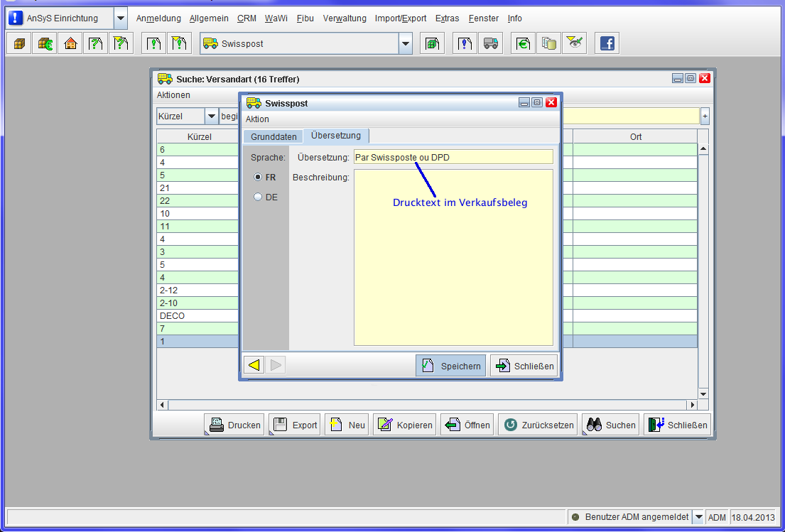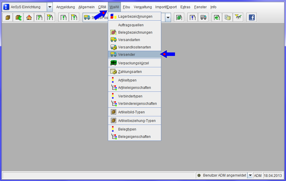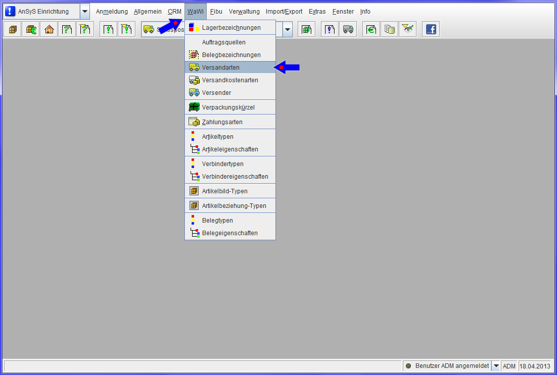 Sie bleiben weiterhin im Modul 'AnSyS Einrichtung'. Navigieren wieder zum Menüpunkt 'WAWI' und wählen jetzt in der dargebotenen Auswahlliste 'Versandarten'.