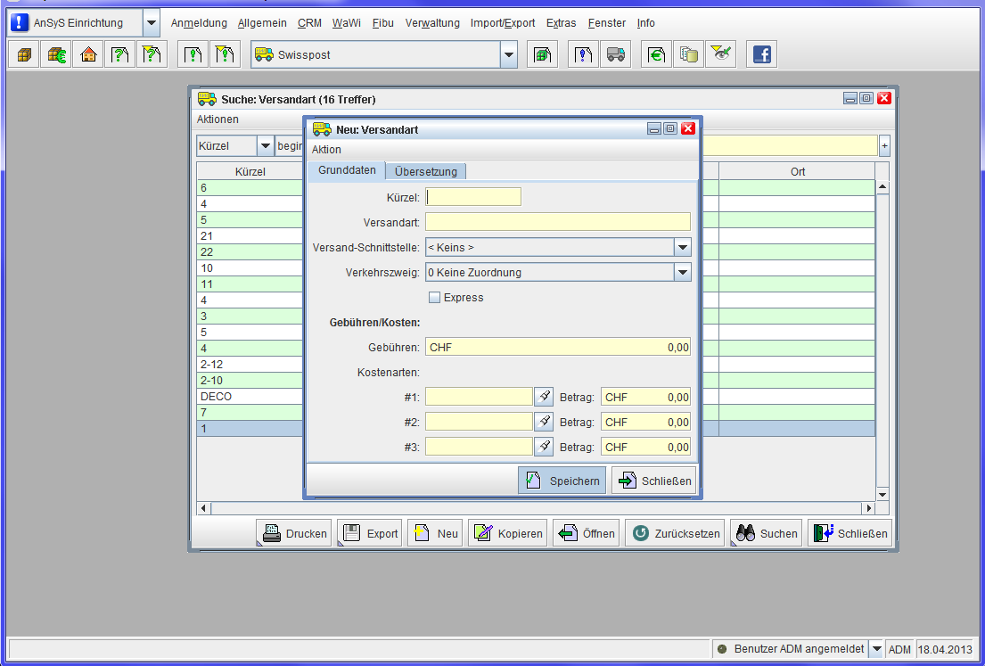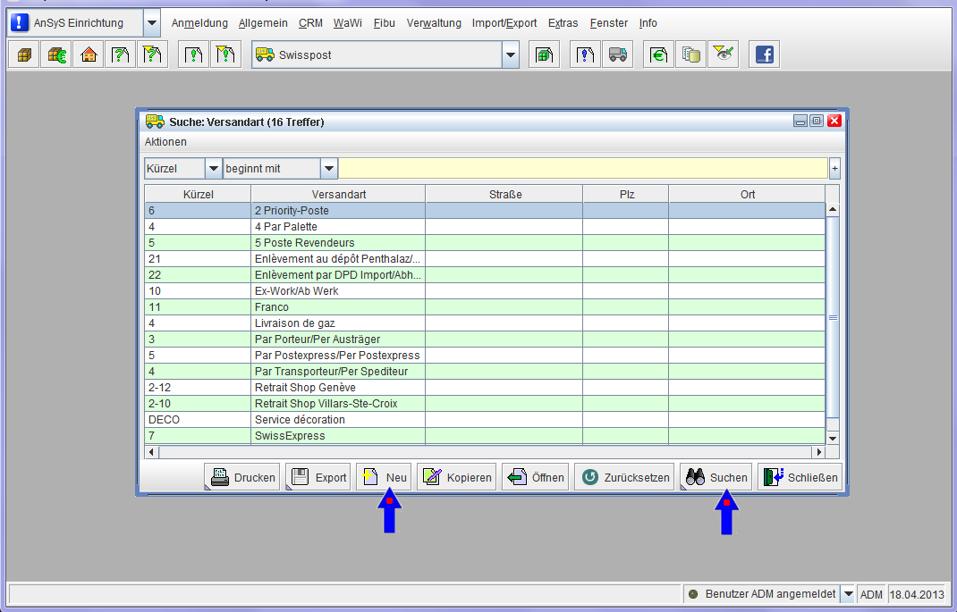 Auch hier können Sie über den Button 'Suchen' bereits vorhandene Versandarten finden oder über 'Neu' eine neue Versandart anlegen.