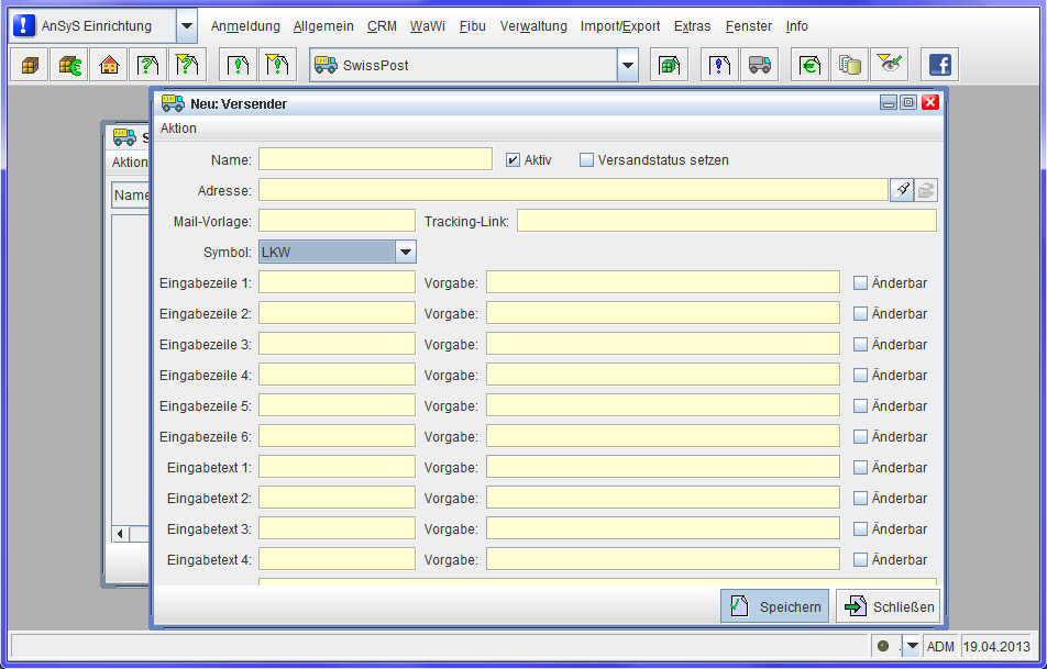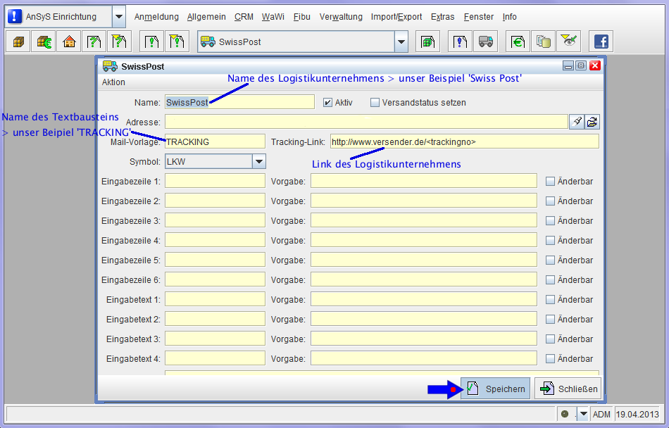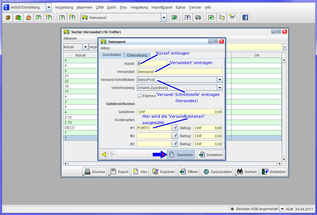 Wenn Sie Ihre Einträge alle vorgenommen haben, speichern Sie über den 'Speichern'-Button den Versender 'Swiss Post' ab.