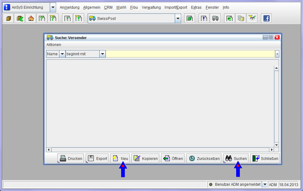 Nun befinden Sie sich wieder im Suchdialog. In diesem Fall für all Ihre angelegten Versender, sofern schon welche existieren. Dies können Sie ganz einfach feststellen, wenn Sie auf den 'Suchen' - Button klicken.
