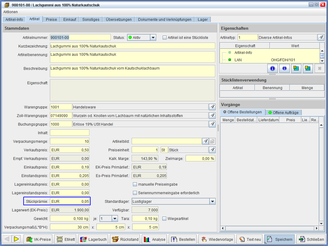 Dies ist für eine Verkäufer-Provision gedacht. Hier kann man einen Betrag eintragen, den der Verkäufer erhält, wenn er diesen Artikel verkauft. Dazu gibt es in der FIBU eine Auswertung 'Stückprämienliste' unter 'Listen und Auswertungen'.