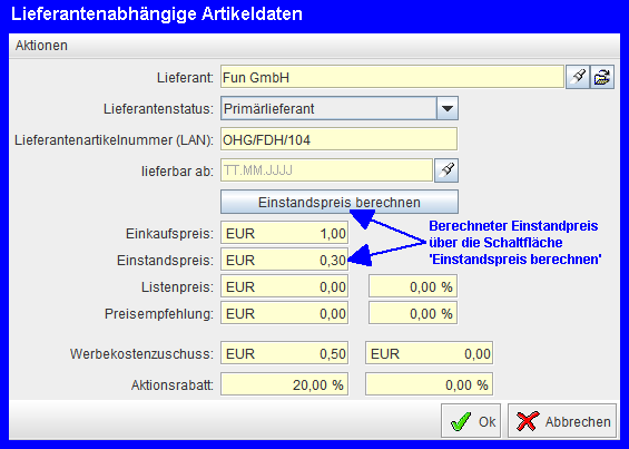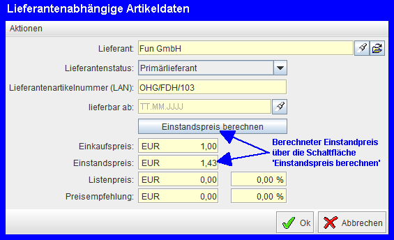 Button 'Einstandspreis berechnen' im Dialog 'Lieferantenabhängige Artikeldaten'