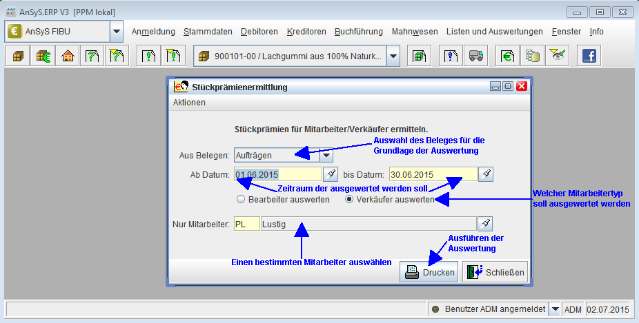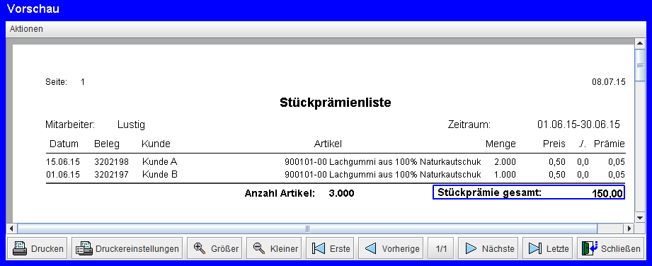 Die Auswertung startet, wenn Sie auf den Button 'Drucken' klicken. Danach sehen Sie die Auswertung und die ermittelte Prämie, die an den Mitarbeiter ausgezahlt werden soll.