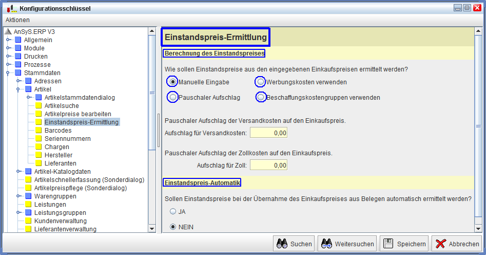 (AnSyS Einrichtung > Verwaltung > Konfiguration > Stammdaten > Artikel > Einstandspreis-Ermittlung)