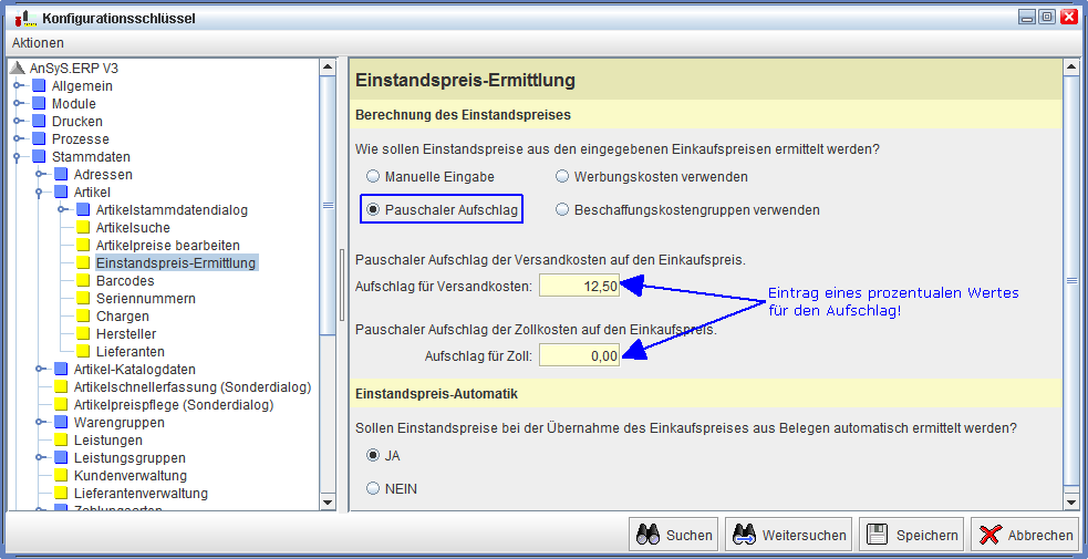 c. Pauschaler Aufschlag Dazu wird in der Konfiguration einfach ein prozentualer Wert hinterlegt, der dann zur Anwendung kommt. Mit diesen hinterlegten Werten, wird dann pauschal der Einstandspreis ermittelt.