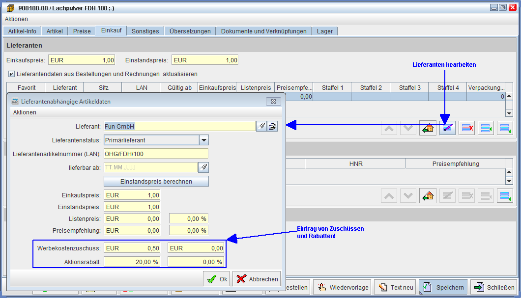 d. Werbungskosten verwenden Ist in der Konfiguration bei der Einstandspreis-Ermittlung 'Werbungskosten verwenden' aktiviert, besteht die Möglichkeit in den Artikelstammdaten bei dem hinterlegten Lieferanten Werbekostenzuschüsse und Aktionsrabatte zu hinterlegen, die auf die Ermittlung des Einstandspreises Einfluss nehmen. Dazu markiert man den hinterlegten Lieferanten und klickt auf die Schaltfläche 'Eintrag bearbeiten' (Stift).