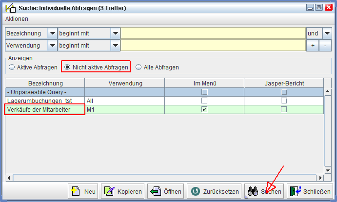 Im Suchdialog suchen Sie nach 'Nicht aktive Abfragen'. Hier wurde die neue Abfrage von uns erst mal implementiert und abgelegt. (Nach Absprache könnte diese auch gleich aktiviert werden.) Darüber wird dann unser Kunde informiert und kann die Abfrage dann zum gegebenen Zeitpunkt selbständig aktivieren.