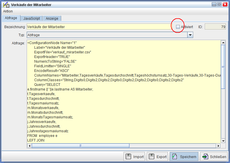 Unter dem Reiter 'Abfrage' neben dem Feld 'Bezeichnung' finden Sie ein kleines rechteckiges Kästchen, wo Sie ein Häkchen setzen können, um die Abfrage zu aktivieren.