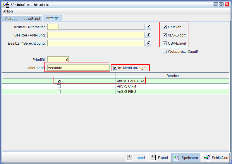 Zusätzlich kann man hier auch noch bestimmen, ob die Abfrage gedruckt und exportiert werden darf. Dafür setzt man die Häkchen in die entsprechenden Kästchen.