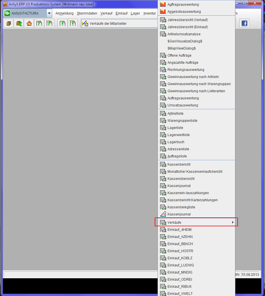 Jetzt wechseln Sie in das Modul 'AnSyS FACTURA' und gehen dort im Menü zu den 'Listen und Auswertungen' und wählen den Unterordner 'Verkäufe' aus. Nun sehen Sie auch die neue Abfrage 'Verkäufe der Mitarbeiter', die Sie nun auswählen können.
