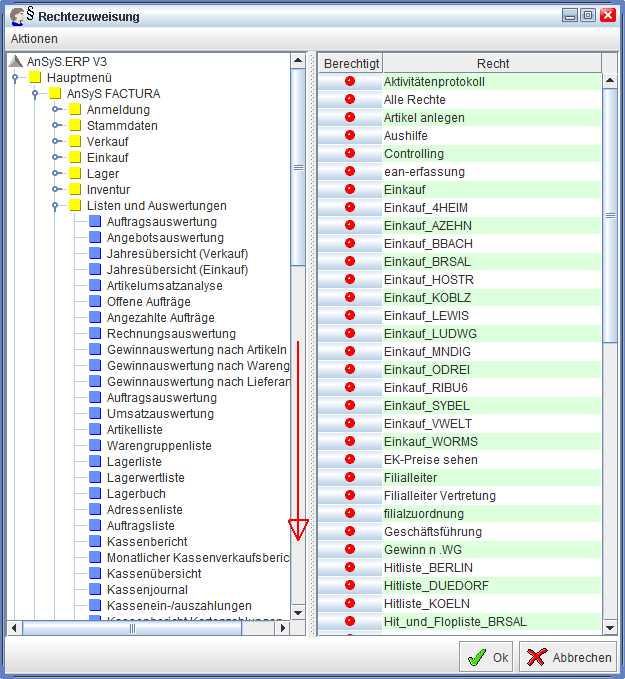 Sie bleiben im gleichen Modul und navigieren im Menü zur 'Verwaltung' > 'Rechtezuweisung'. In dem sich nun öffnenden Dialog sehen Sie rechts die Baumstruktur und links die ganzen Rechte, die im Programm bisher angelegt wurden.